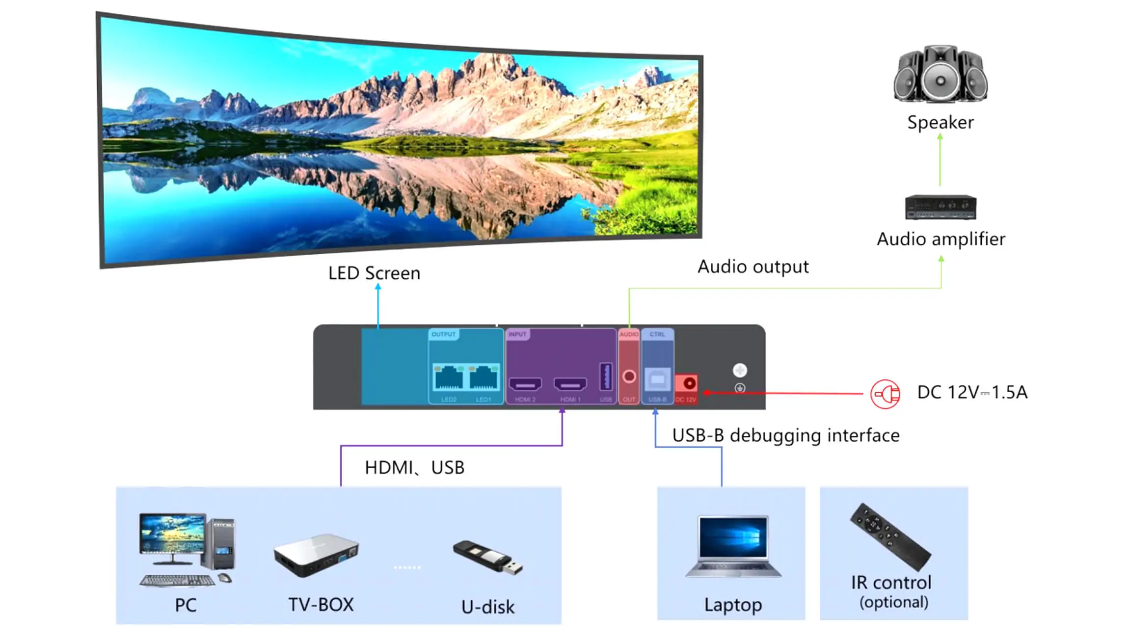 1 channel USB input supports direct playback of videos and pictures in various mainstream formats in the root directory of the USB flash drive, and supports up to 1920×1080@30Hz high-definition video playback;